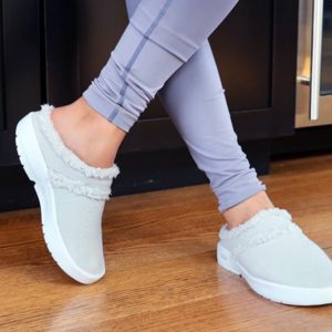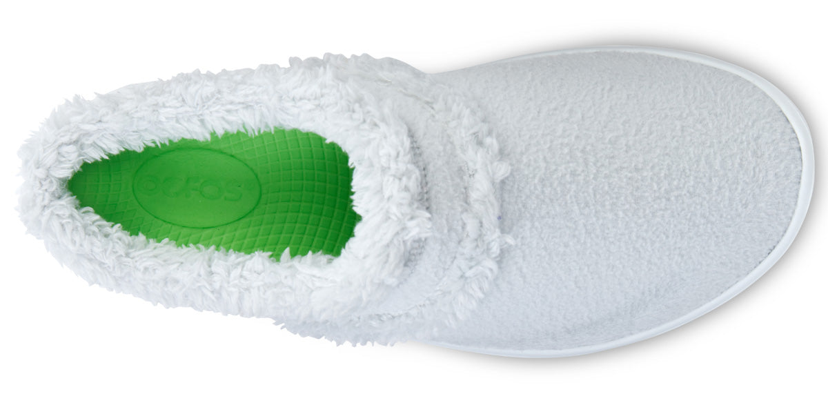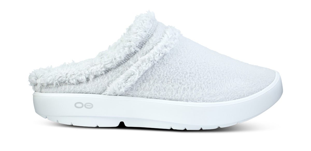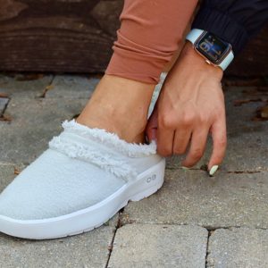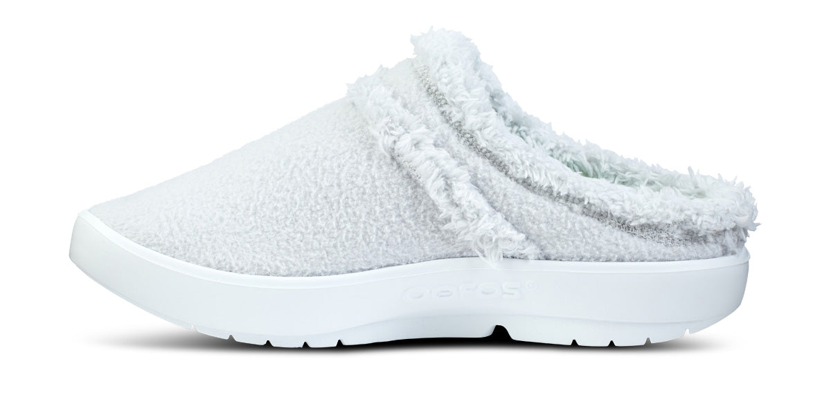 FINAL SALEnPlease note: recommends buying half a size up in this style.nThe OOcoozie provides the perfect blend of cushion and stability for both indoor lounging and quick errands out. Now in a mule style with an easy, no fuss, slip-on design for your on-the-go lifestyle. The upper is constructed with a warm vegan sherpa material that is both recyclable and machine washable. Like all products, it has our unique one-of-a-kind OOfoam™ technology that absorbs impact, so your body doesn’t have to. Active recovery with the soft, cozy warmth you desire in a versatile hygge style.